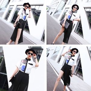 Details: Button up; Front pocket non-functional; Back of blouse has no print, just plain white back.