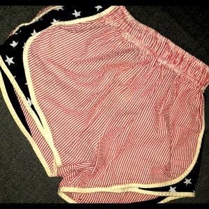 Shorties seersucker shorts. Red white stripe with navy blue sides/with stars. Elastic waistband with drawstring inside shorts. See pics for approximate measurements. Size XS. Excellent condition!