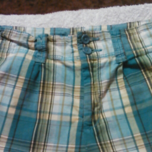 Green plaid shorts, 2 buttons and zipper. 5 belt loops. 2 front pockets 2 back pockets with buttons on each Pocket. 98% cotton 2% spandex.
