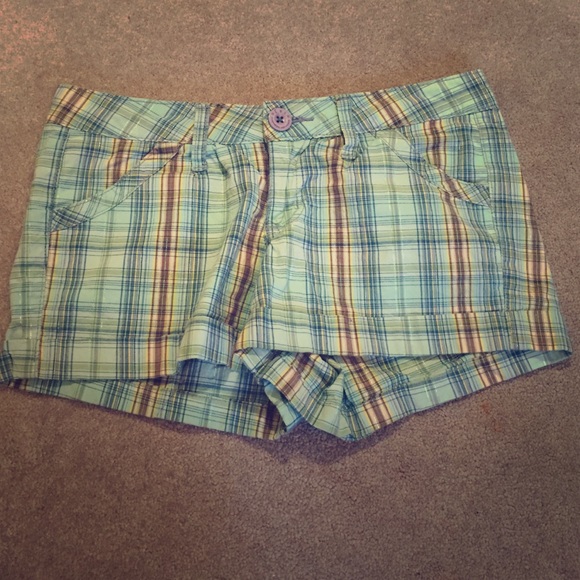 L.e.i. Brown,yellow, green plaid shorts. There are some shiny/ sparkly strand that make them look really cute! Like new condition!