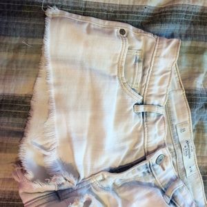 Two pockets in the front and two in the back. Booty shorts. White and some parts are light blue.