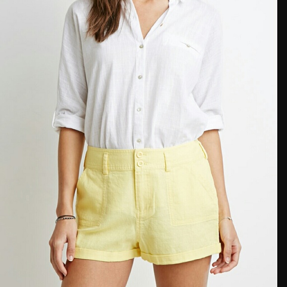 A pair of stretch lien shorts with a classic four-pocket construction and zip fly.