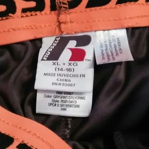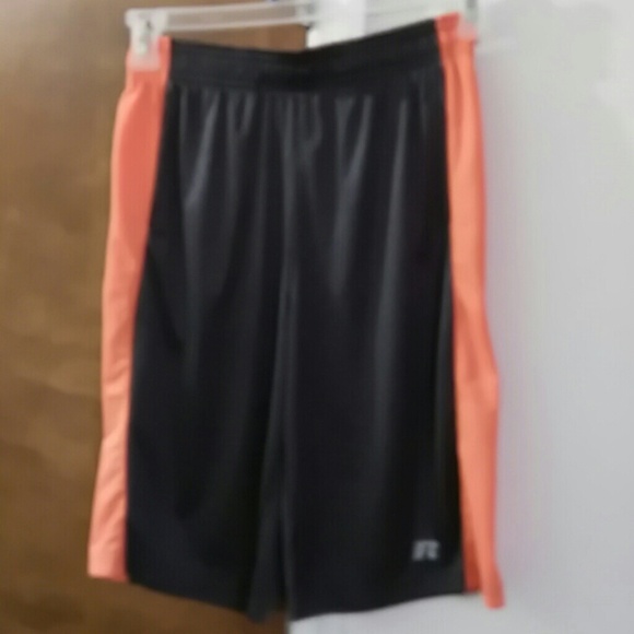 Russell Brand workout shorts- grey with design on front, orange stripes down the side, with pockets. 100% polyester. No snags or picks.