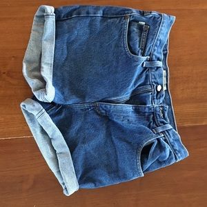 They are high waisted, dark blue denim, rolled up on the bottom, very cute, a belt is recommended