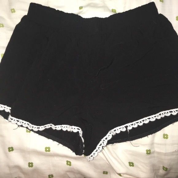 Black shorts with white lace detailing on the bottom. Perfect for the beach or just a regular day in the summer.