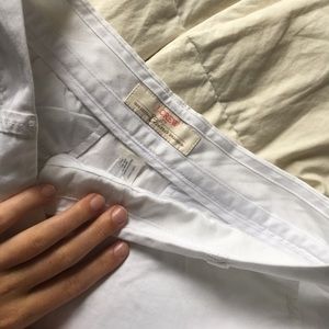 They're a pure white colored shorts. They're a comfy fit. They're khaki like. Barely worn. They're approximately 13 inches from top to bottom in the front & 14 1//2 inches in the back from top to bottom.