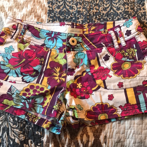 Just a pair of fun, wild shorts. White shorts with pink, yellow, light blue, green, and purple. A fun summer short.