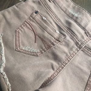 These shorts are more clay-brown than light brown as depicted above in the photos. They appear lighter than they actually are. Fringe marking on bottom. In good condition