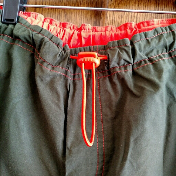 Olive green with orange detailing. Drawstring waist. Cargo pockets with Velcro closure on sides. Wide legged. Cotton/nylon blend.