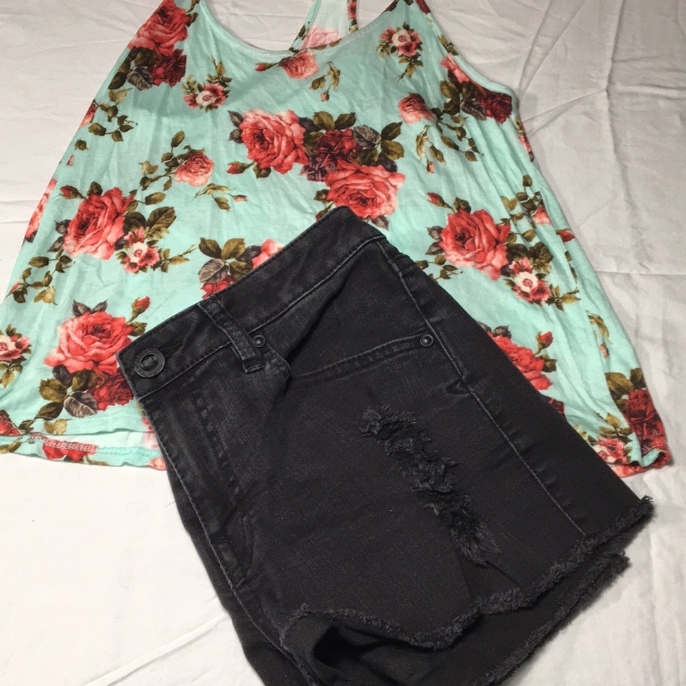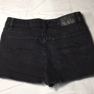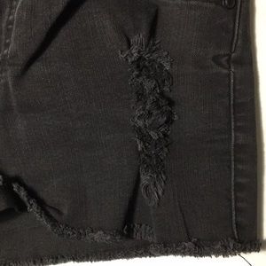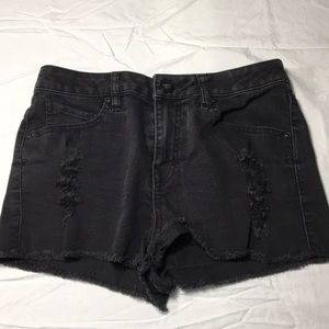 High-waisted black jean shorts with small rips on both legs and frayed detailing on the bottom. Will pair well with any tank or tee! Super cute for the summer!