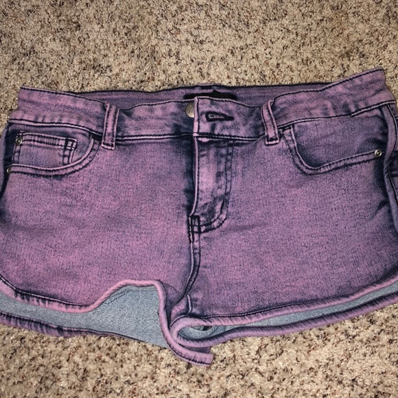 These purple, washed shorts are stretchy and cute! The fabric isn’t exactly jean, but it’s stretchy and comfortable. There are no stains or rips. They are nice but too small for me!