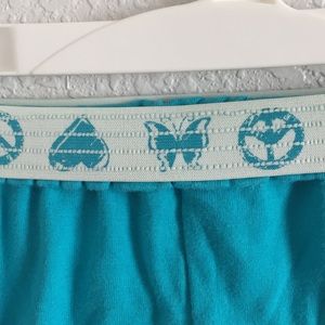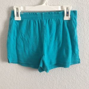 Turquoise soft cloth material shorts with stretchy and foldable waistband.