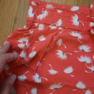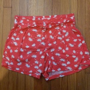 Poppy colored shorts with white flowers on them
