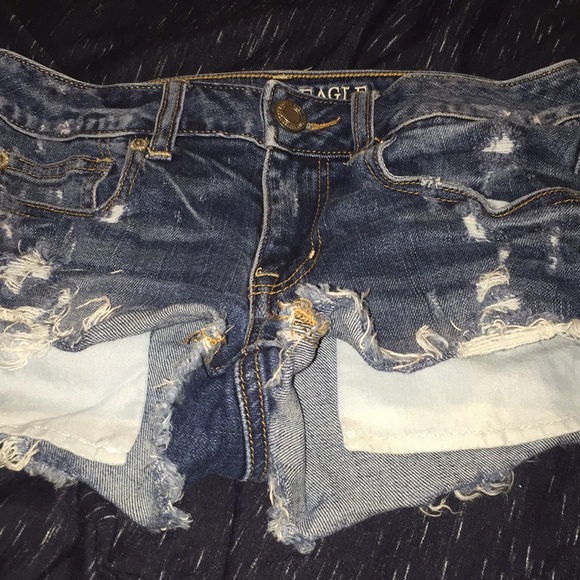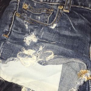 Short distressed jean shorts, pockets hang out