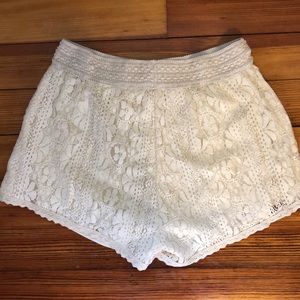 Cream colored shorts with lace detailing all over. They fit a bit high waisted and the waist is stretchy.