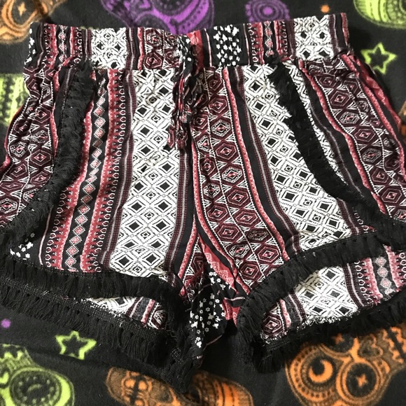 Black maroon and white shorts. Has fringe around leg openings elastic waistband