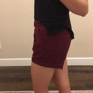 Burgundy red shorts with two buttons one hidden and a zipper