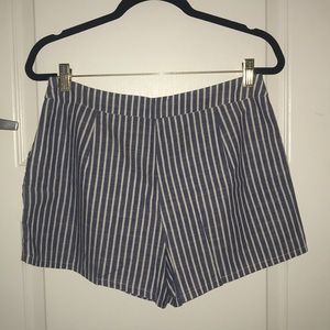 Dressy light denim and white striped shorts with bow detail on the front, pockets, and side zipper enclosure.
