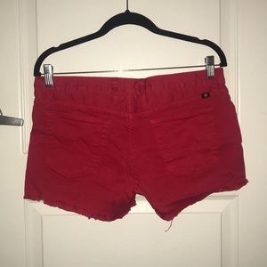 Lucky Brand red denim shorts with short fringe on the bottom.