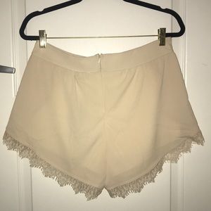 Dressy beige colored shorts with zipper enclosure on the back, liner, and lace details on front and bottom.