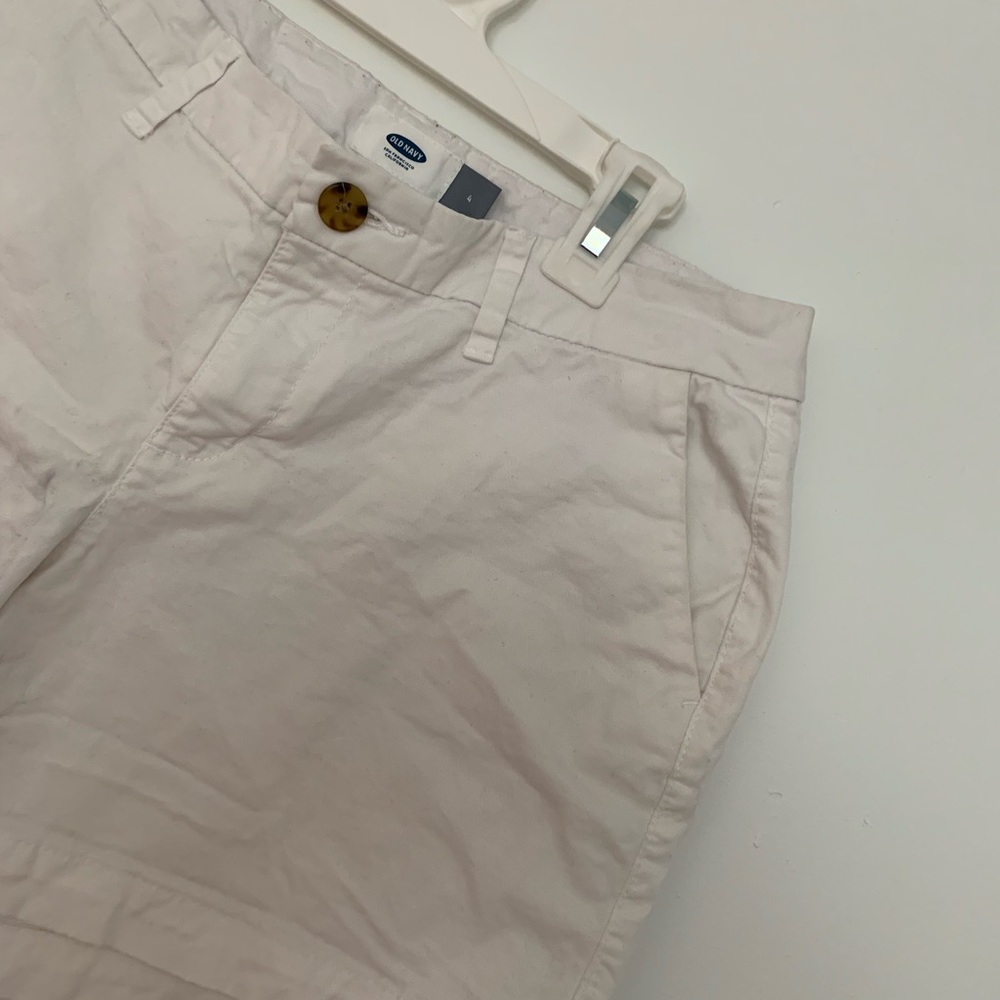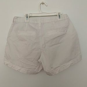 White shorts. Not too long - not too short. Wrinkly because they’ve been folded up for a year. I’ll rewash and dewrinkle them! They say size 4 but fits 4-6!