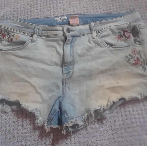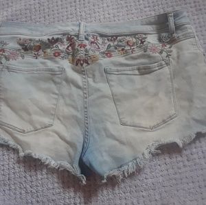 These shorts are distressed and have folower stitching on front and back.