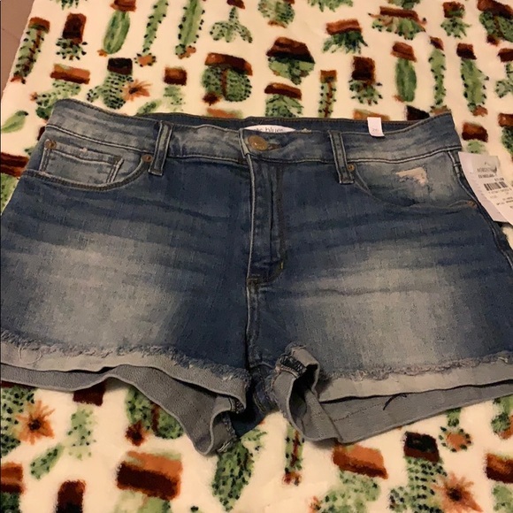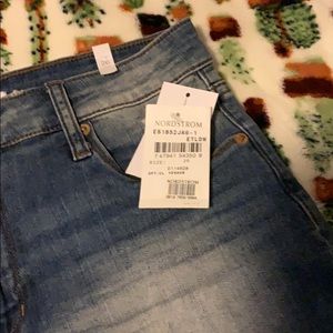 A pair of jean shorts purchased at Nordstrom size 26 waist still has tags attached brand STS blue zip up one button has the hemmed fold at the bottom with stretch
