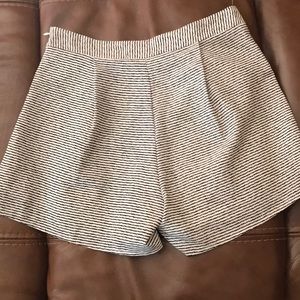 Black and white striped short in excellent condition. It is a silk like material lightweight fully lined in white. It has two pleats on the front and back as seen in the picture. The back is slightly longer than the front. It has a side zipper closure.