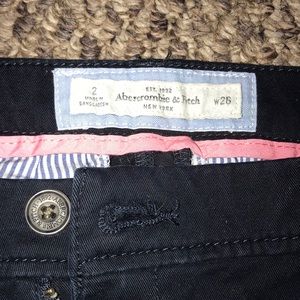 Navy blue shorts with white Abercrombie and Fitch logo above back pocket on right side.