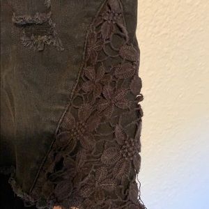 Black jeans shorts with lace. No tears. Just holes that are the design of shorts