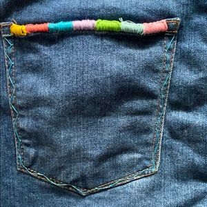 Denim shorts with rainbow hand stitching.