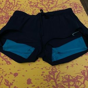 Navy blue on the outside with a brighter blue is on the inside spandex part.