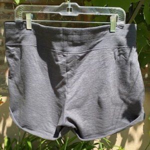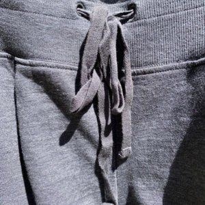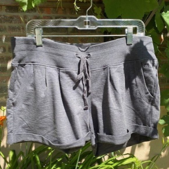 Charcoal grey drawstring shorts. Front pockets, pleats, and cuffed hem. Inseam - 3 inches.
