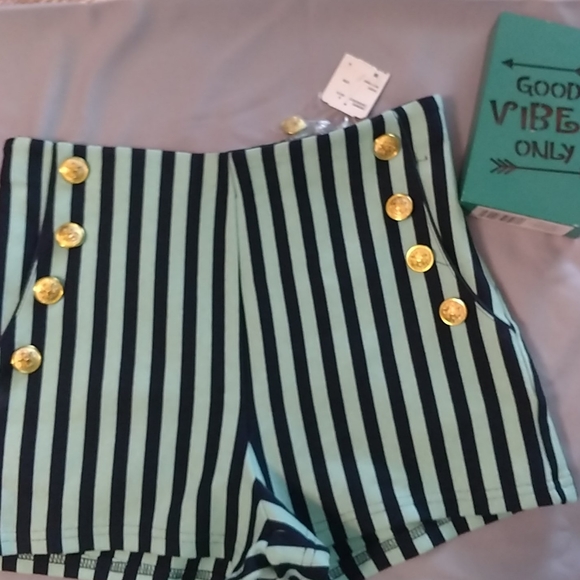 Mint & Navy, elastic waist with decorative gold buttons along pockets
