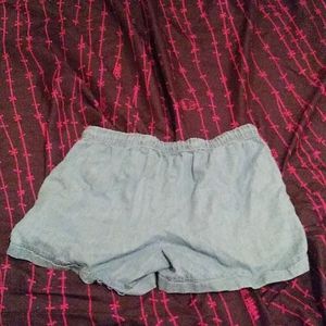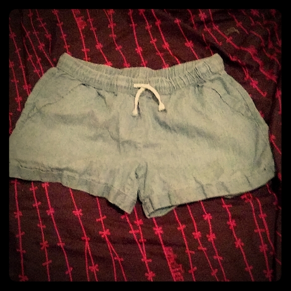 Blue shorts has two pockets on each side of shorts and a little tie on the front to tie them.