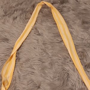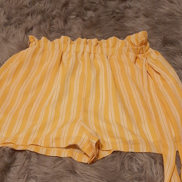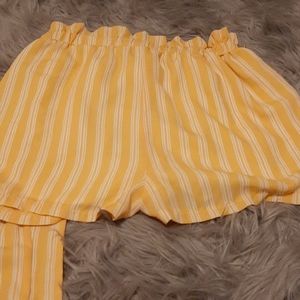 Yellow, white stripes, flowy, has a second layer inside, ties in the front, the tie can come off of the shorts.