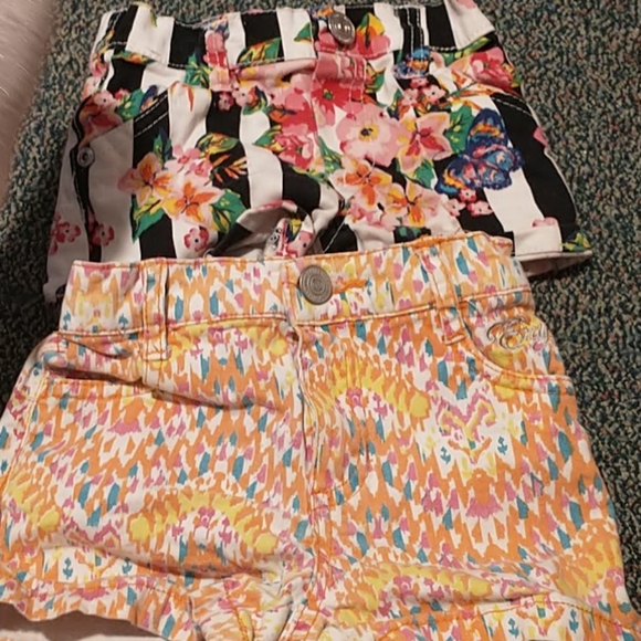 2pair shorts 12 month one pair white flower print other pair white splash orange blue pink yellow in them enyche brand