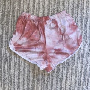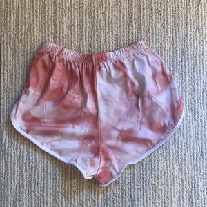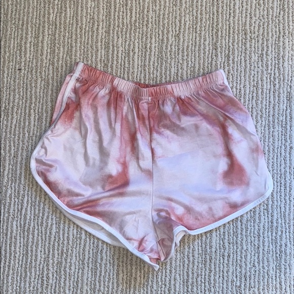 These are tie dye white and pink shorts. The waist band is stretchy and will extend while also fitting snug. The sides of the shorts are lined with a white outline as well as the bottom of the shorts. These shorts are made from 100% polyester.