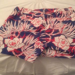 Red, white and blue floral shirt. Can give that nautical vibe. 2 front slash pockets, 2 back slit pockets. Belt loops, zip closure front. 98% cotton, 2% elastane. Size 0 nwot