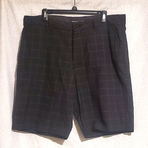 Dark grey with thin white and black stripes. Front and back pockets, and belt loops.