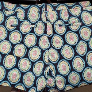 Crown & Ivy shorts. Base color is navy blue with turquoise, hot pink, lime green and white. Button and zip fly. Two front pockets. Two back pockets.