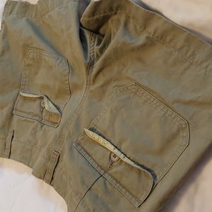 olive Chino shorts with front and back pockets, has flaps and button on back pocket. also has a key pocket, zipper with hook and eye.