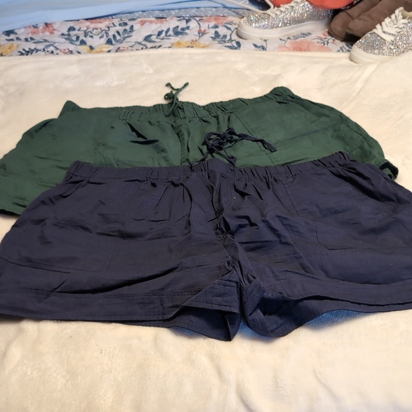 One green and one blue pair of soft relaxed shorts. You can use to ride a bike be active or with a cute T-shirt and sandles