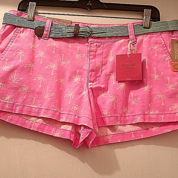 pink and white palm tree print Mossimo shorts functional pockets in front and back with the teal belt.