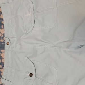 Shorts to the knee with option of buttoning up the sides for a better look. The material is 50% polyester, 30% cotton, 20% nylon. There are 2 pockets on the sides in front and 2 pockets on the legs in front. In back there are 2 pockets with button closing and 1 of the buttons is missing.