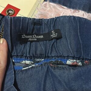 Blue Jean , dark , soft material with gathering at the waist. Cute belt attached. These are brand new with no rips or stains. Tags attached