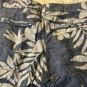 Leaf print fabric the look of them are blue jean. Thin fabric with leaf print. Has two side pockets and two back 1/2 pockets.