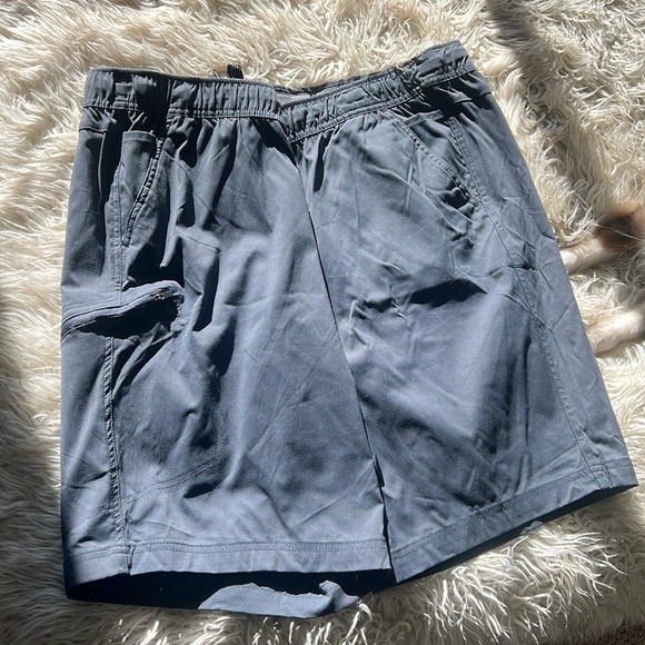 Elastic waist with drawstring tie. Side pockets plus one zipper cargo pocket on right leg. 10.5inch inseam