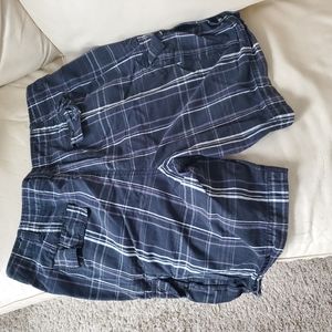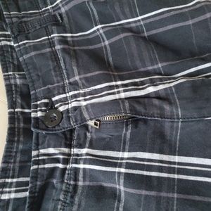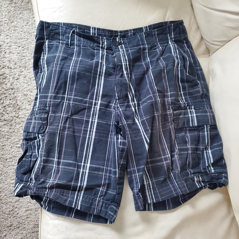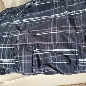 Plaid cargo shorts with side and back pockets. Black with gray and white plaid design. 100% cotton.