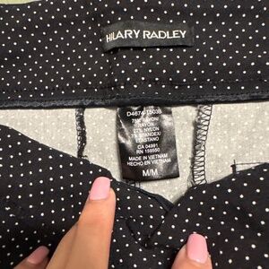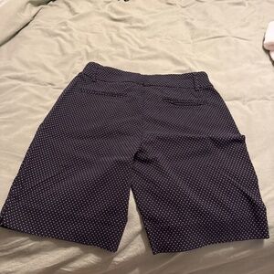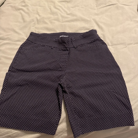 Pull on shorts with a little stretch. Very comfortable only were twice. Has front pockets. And belt loops. Navy blue that looks like black with white polkadots.